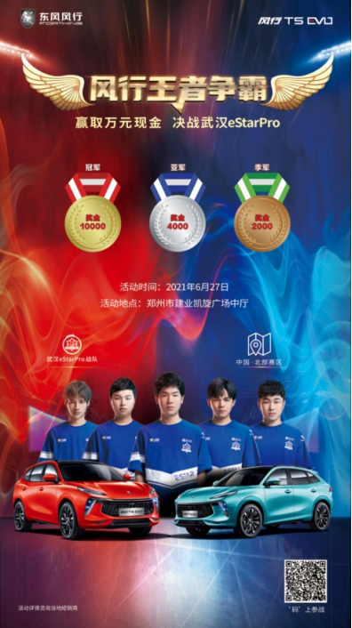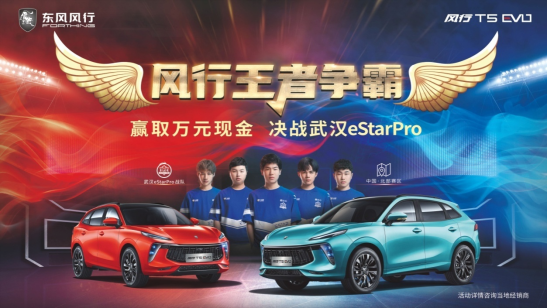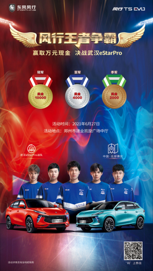 用操控说话 为荣誉加冕,东风风行T5EVO联合王者荣耀实力战队——武汉eStarpro向北部赛区的电竞粉丝发出挑战邀请,即日起至东风风行品牌授权专营店报名参加王者荣耀游戏互动,约战武汉eStarpro即有机会赢取万元现金。