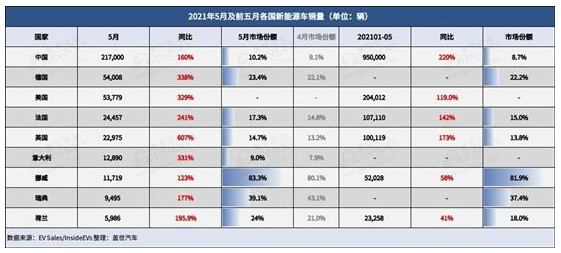 5月,全球新能源车市捷报频传,延续普遍复苏之势。在盖世统计的9个国家中,全部国家的新能源汽车月度销量呈三位数同比增长,英国以超600%的增幅领涨;除美国数据未可知和瑞典有所下滑外,七国电动车市场份额持续扩张,超过4月份水平。