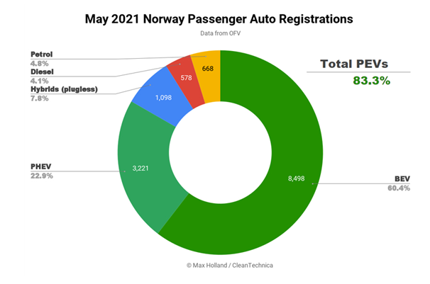 挪威:电动车市场份额达83%,内燃机汽车份额降至最低点