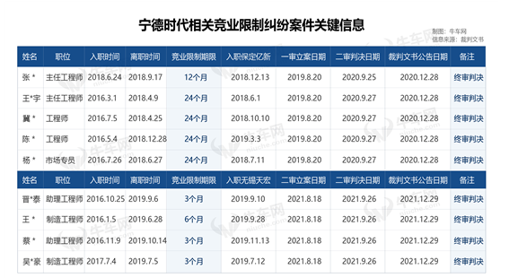 2019年以来,宁德时代先后与九位分别入职保定亿新和无锡天宏的前员工发生竞业协议纠纷。