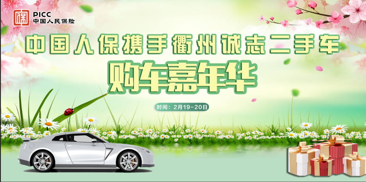 中国人保携手衢州诚志二手车购车嘉年华活动火热报名中。活动时间:2月19日-20日,在浙江省衢州市三衢路1077号4幢7号举办购车优惠活动。报名热线:13757013335,我们专注办好每一场活动,只为您买到价格实惠的车,为客户提供专业、优质的汽车团购购车体验。